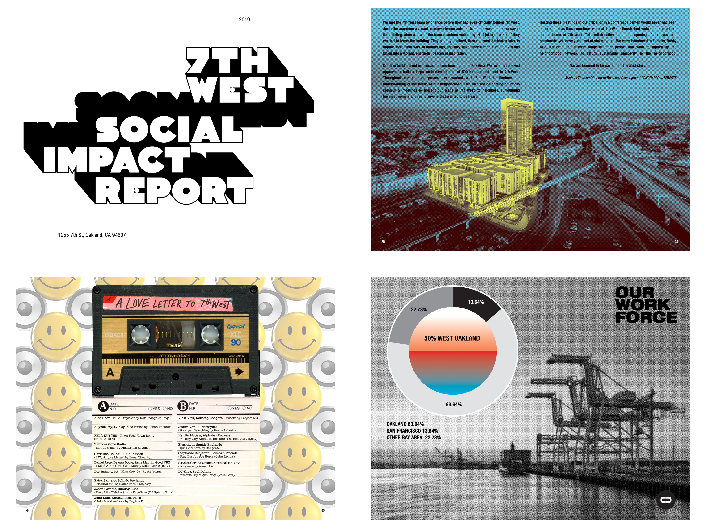Since 2018, 7th West has been an important community hub for West Oakland. They support local music and artist communities through their programming, which includes world music events and local DJ nights. To reflect the communities of which West Oakland is composed, I chose a minimalist brand identity and art direction inspired by their address - 7th and West Street. A mural featuring the quote "come together" with a vibrant color scheme enhances the venue's mission statement and brand. The publication design of its social impact report inspired by a 90s rave zine aesthetic captures the art direction of the space, with bold imagery and diverse typography to deliver their powerful message. A merch capsule was also created, taking inspiration from both contemporary and classic pop culture. This expands 7th West's cultural footprint and also positions it as a trailblazer in community-driven design, solidifying its status as a powerful force in West Oakland's creative landscape.